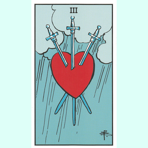 Underneath your deck, you have the 3 of Swords. It's easy to look at this card and see heartbreak.—a heart with swords going through it. I look at this card and try to see 3 plus Swords, as in abundance of thoughts, which can certain cause heartbreak. And this is one of those cases where I think it can be both. If I had to guess, this is one of those times where true insight fell on you like a cartoon piano and broke you.