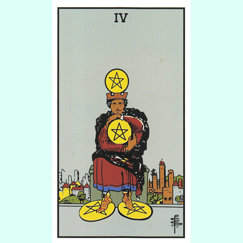So let's look at our Stop card for this week. You have the 4 of Pentacles. Four is a number of stability and protection, associated with The Emperor, who exists sort of opposite of Justice, in the same way that Aries is opposite of Libra. This is reminding you to take yourself into account when you do the math. And not this idealized version of yourself, but The Reality Of You.