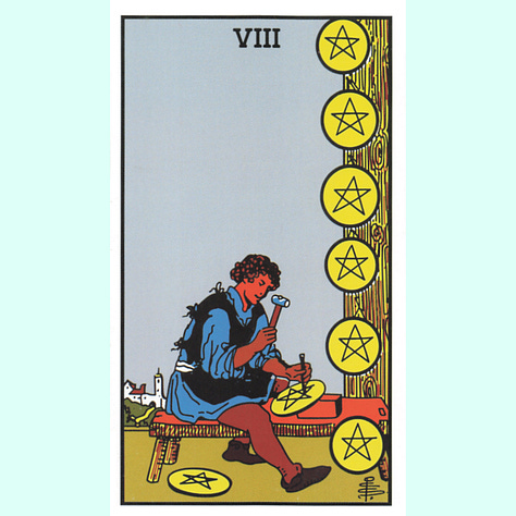 Which ties back to the Ace of Wands being underneath your deck—this desire to start something new. The Magician isn't good at whatever it is he's trying to do right off the bat. He holds space for improvement. So with that context, we look again at this 8 of Pentacles and it gives some new flavor.