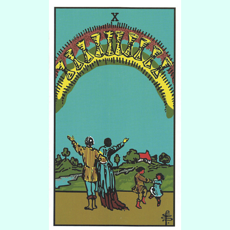 This, of course, is not how I would normally read these two cards together (the 9 and Knight), but they make sense considering your Start card. We have the 10 of Cups in reverse. It sent a little bit of a shiver down my spine when I flipped this card over and saw it in this position. The 10 of cups is supposed to be a happy time! Where, not only are you happy in a personal sense, but you're happy in the context of a community that supports you.